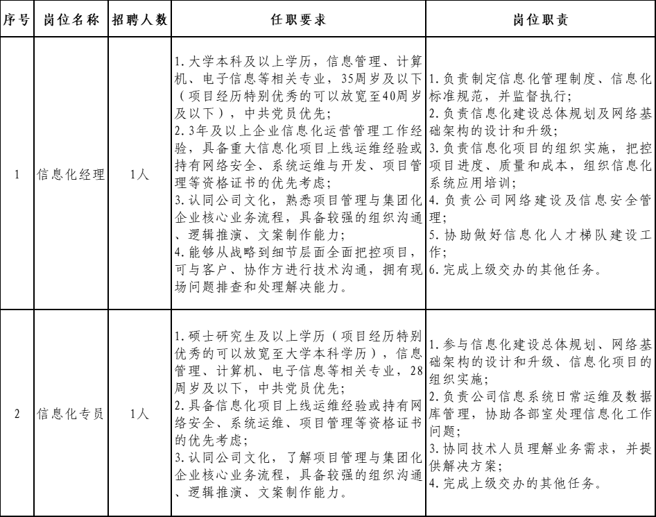 为满足信息化建设用人需求,现将kaiyun开云官方2022年度信息化岗位员工招聘有关事项公告如下: