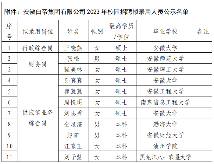 根据安徽白帝集团有限公司2023年校园招聘工作安排,经公司党委会议研究,现将拟录用人员王晓燕等11位同志进行公示,公示期2022年12月13日-2022年12月19日(五个工作日)。