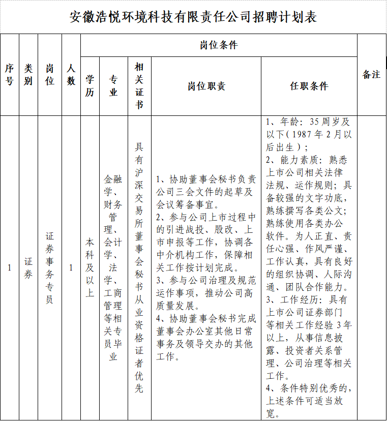 招聘具体岗位及要求详见《安徽浩悦环境科技有限责任公司招聘计划表》