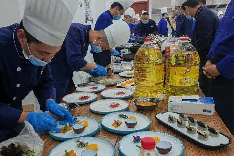 技绎精彩,以赛促练。本次比赛为单人赛,竞赛形式为实操,结合皖中菜肴等合肥美食文化特色命题。30余名专业选手同台竞技,互拼厨艺。现场气氛紧张热烈,选手们沉着冷静比刀工、精雕细琢做拼盘、煎炒烹炸显神通,一盘盘造型精致的菜品在大厨娴熟的技艺中纷纷精彩亮相。