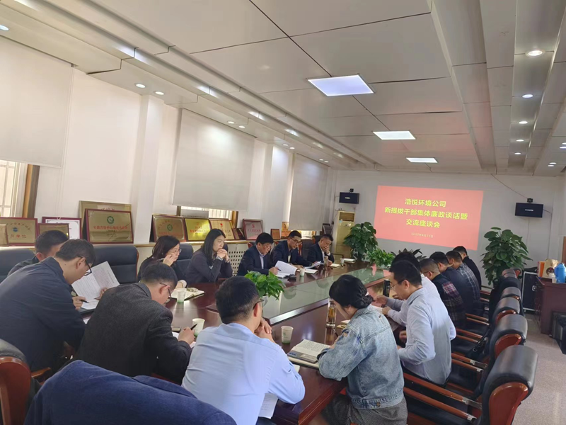 为进一步加强对新任干部的管理和教育,切实增强党纪意识,筑牢廉洁自律防线,4月11日下午,浩悦环境公司召开新提拔干部集体廉政谈话暨交流座谈会。会议由公司党总支委员、总经理王守林主持,党总支书记、董事长李叶胜出席会议,党总支纪检委员、副总经理董慧莲,党总支办公室主任谢红彬,人力资源部经理徐迎娣参加会议。