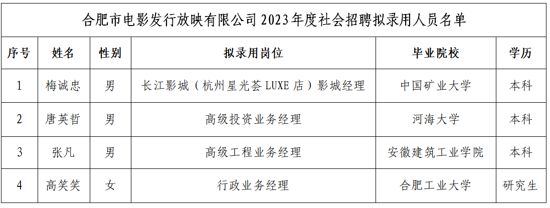 根据《合肥市电影发行放映有限公司2023年度社会招聘公告》规定,经研究决定,现将拟录用人员名单进行公示,公示期自6月13日至6月19日。