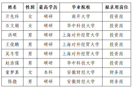 根据《合肥市创新科技风险投资有限公司2023年社会招聘公告》,经研究决定,现将拟录用人员名单进行公示,公示期从2023年7月31日至8月4日。