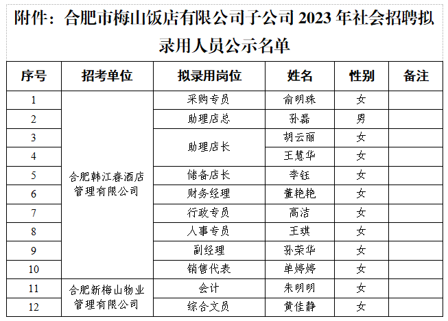 根据合肥市梅山饭店有限公司2023年社会招聘工作安排,经研究决定,现将旗下子公司合肥韩江春酒店管理有限公司、合肥新梅山物业管理有限公司拟录用12 名工作人员名单进行公示,公示期从8月29日至9月4日。
