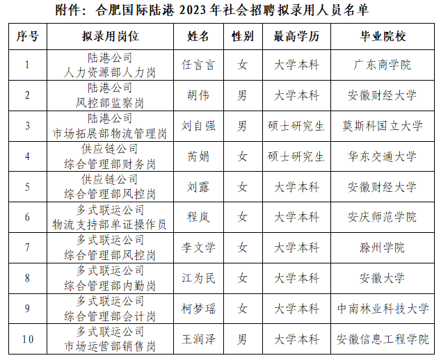 附件:合肥国际陆港2023年社会招聘拟录用人员名单