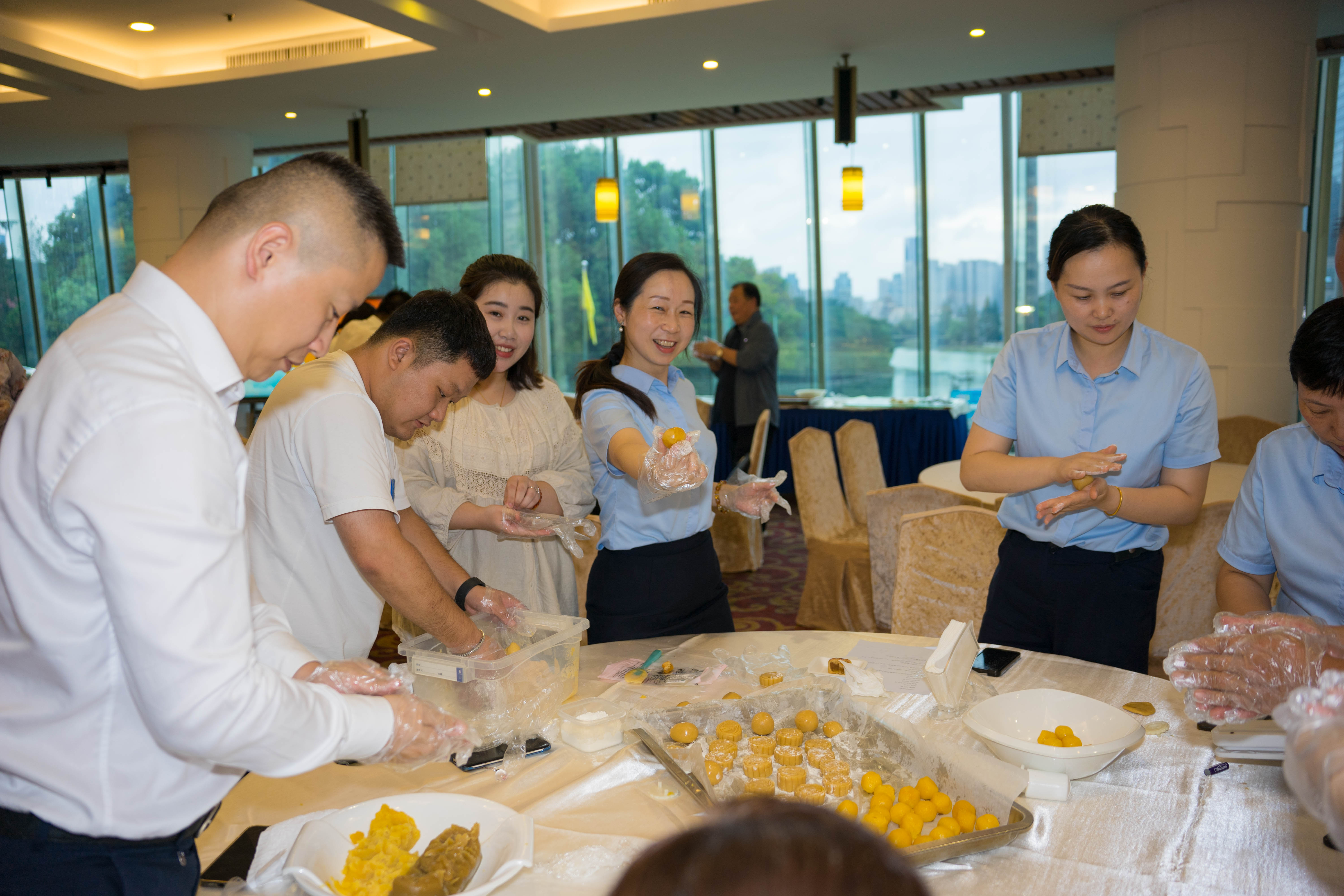 共叙良辰,趣制月饼。活动邀请了经验丰富的糕点师现场介绍传统广式月饼的制作工艺,并指导大家自制手工月饼。月饼制作,也同样具有一整套完整的制作工艺和流程,只有分工协作、互帮互助才能完成整个制作过程。一枚小小的月饼,食材可谓琳琅满目。面对丰富多样的食材和制作工具,大家跃跃欲试,参与积极性很高。在糕点师的指导下,员工们有序制作。首先,要细心地分好皮馅,再上称控制克数和比例,经过一番揉搓和包裹后,用模具将月饼压制成型,最后进行烘烤并包装。