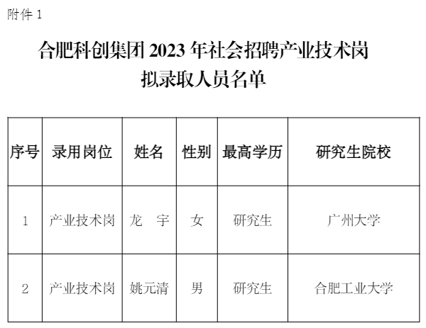 附件: 合肥科创集团2023年度社会招聘拟录取人员名单(2人)