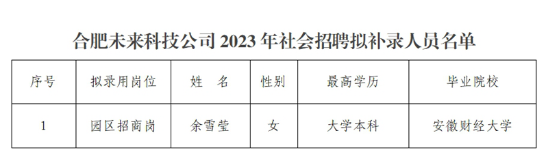 根据《合肥未来科技产业投资发展有限公司2023年度社会招聘公告》,现由于本次社会招聘部分岗位空缺,为加强人才团队建设,经公司研究决定,现对拟补录人员进行公示。公示期2023年10月9日至2023年10月13日。