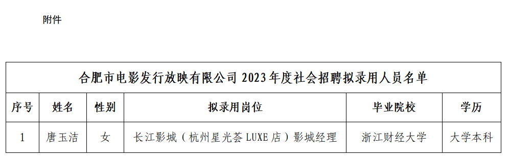 附件:合肥市电影发行放映有限公司2023年度社会招聘拟录用人员名单
