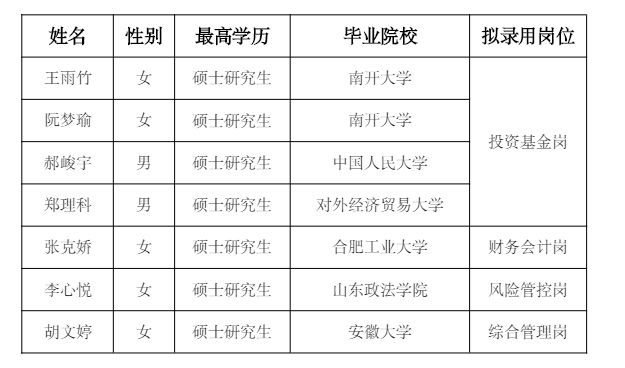 根据《合肥产投资本创业投资管理有限公司2024年校园招聘公告》,经研究决定,现将拟录用人员名单进行公示,公示期为2024年2月1日至2月6日。