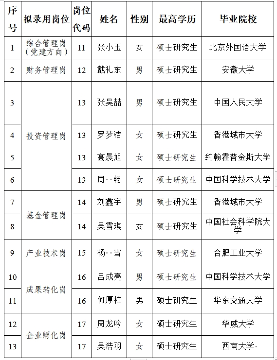 附件1:合肥市科创集团有限公司2024校园招聘拟录用人员名单(13人)