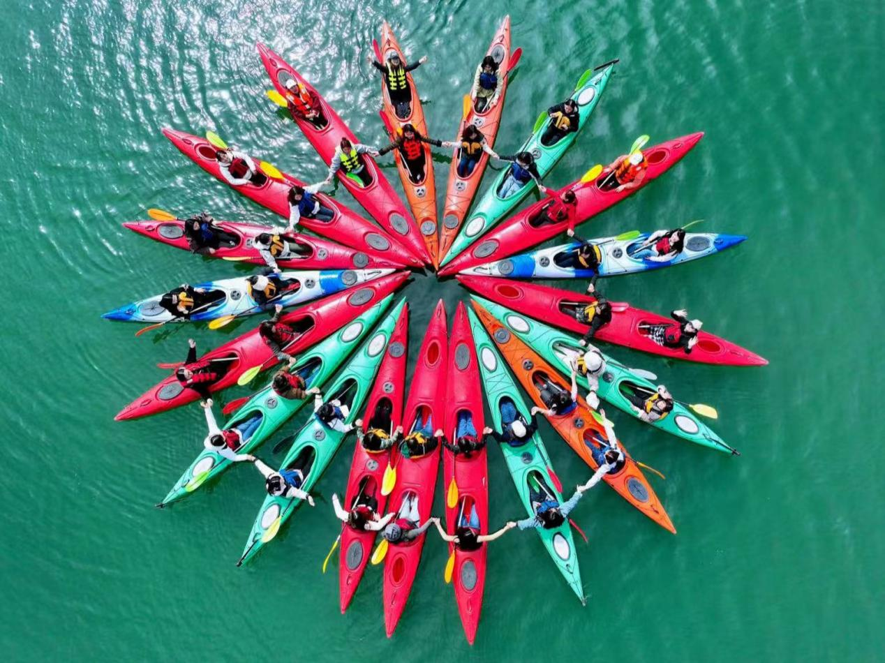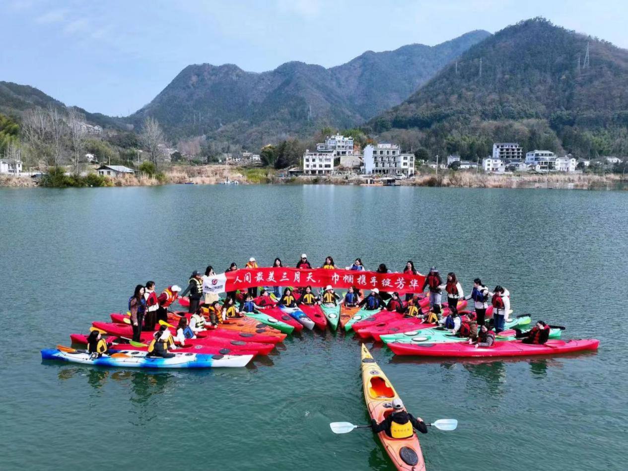 三月草长莺飞,大家放下平日的疲惫和压力,一路欢歌笑语,经过三个小时的车程,到达安徽省黄山市黄山区的太平湖风景区,体验皮划艇运动。进入场地后,专业教练对大家进行热身教学,寓学娱乐,放松身体。到了下水的时刻,大家两两搭档,开始适应水上环境和协调划艇。只见湖水清澈碧透,青山起伏连绵,风姿绰约,岛屿散落如珠。泛舟湖上,大家沉浸式感受春日暖阳,好不惬意。最后冲刺阶段,每队四艘双人艇成团,展开了一场速度竞赛,感受乘风破浪的激情与快乐。