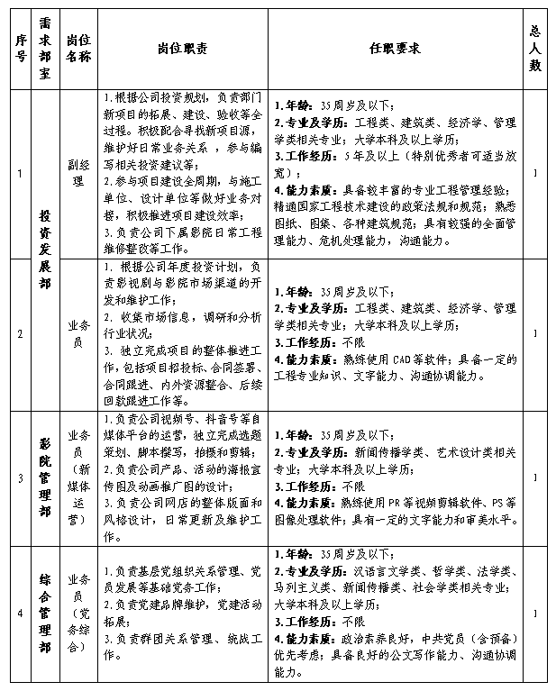 根据公司发展及人才队伍建设需要,拟面向社会公开招聘4名工作人员,有关事项公告如下: