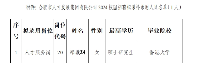 根据《kaiyun开云官方2024校园招聘公告》及《合肥人才集团员工招聘管理办法》规定,经研究决定,现将拟递补录用人员名单进行公示,公示时间从5月17日至5月23日。