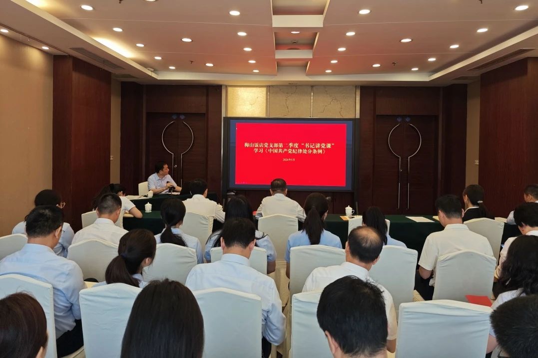 5月31日,梅山饭店党支部组织召开党纪学习教育专题党课暨意识形态专题党员大会,公司党支部书记、董事长娄俊作党纪学习教育专题党课报告,支部副书记、常务副总经理朱楠主持会议。公司领导班子成员出席会议。全体党员、各部室子公司通讯员参加会议。