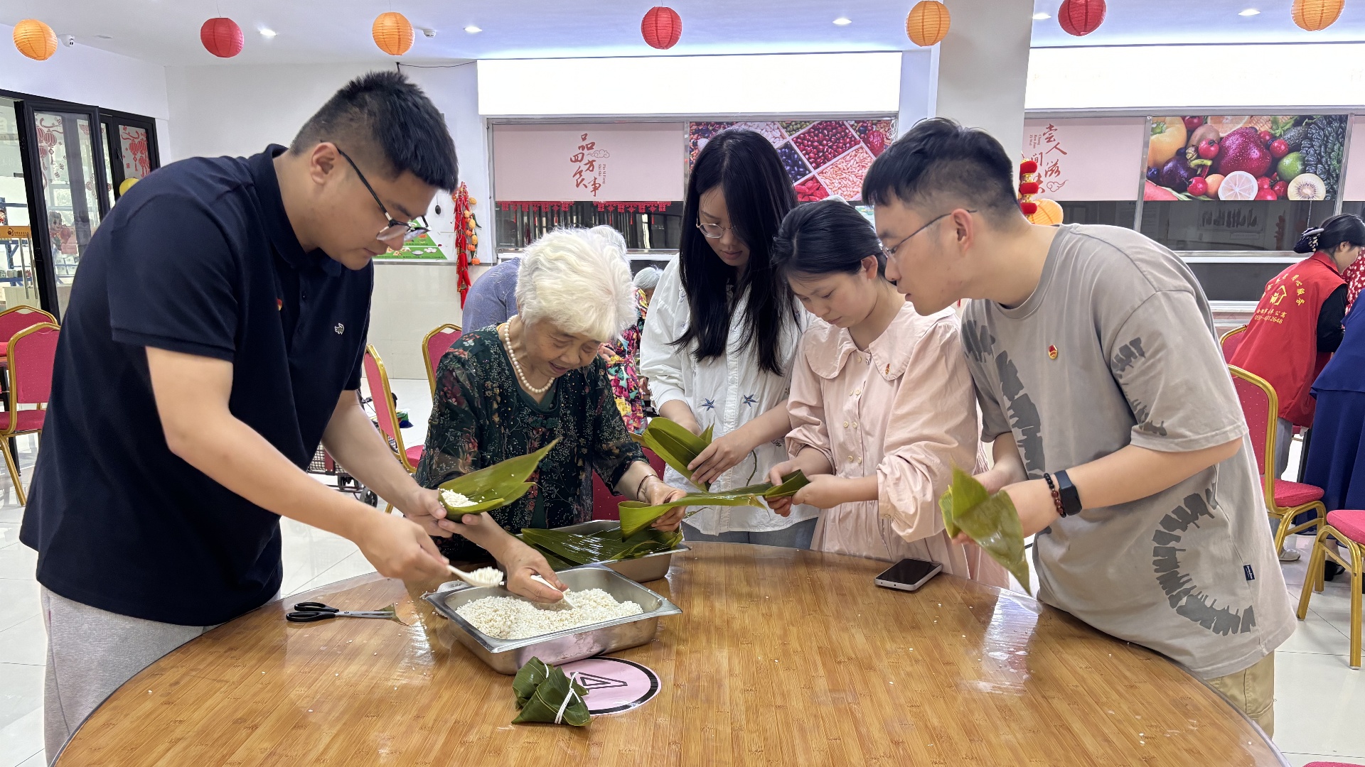 走秀结束后,职工们陪同长者们共同包粽子。大家压紧馅料,扎好绳子,欢聚一堂,共同感受端午韵味。大家在欢声笑语中享受包粽子的乐趣,在场的每一位脸上都洋溢着笑容。