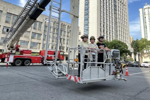 随后,教官带领大家参观了各种消防车辆,并详细介绍了各种车辆的性能及用途。教官还给大家示范了抢险救援服的穿着步骤,并且让部分员工穿上抢险救援服进行体验。在室外训练场,大家登上了“胆颤心惊”的云梯,手持高压水枪灭火喷射,亲身体验了一把消防官兵的辛苦与不易。