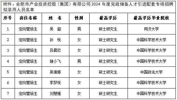 附件:合肥市产业投资控股(集团)有限公司2024年度党政储备人才引进配套专场招聘拟录用人员名单(7人)
