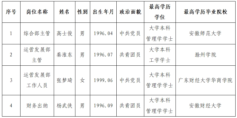 根据《合肥市产业投资控股(集团)有限公司员工招聘管理办法》和《巢湖市国信投资有限公司2024年度员工招聘公告》,经公开报名和资格初审、笔试、面试、体检、背调等程序,拟录用高士俊等4名同志为我公司员工(试用期三个月),现予以公示,拟录用人员信息如下:
