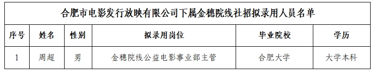 根据《合肥市电影发行放映有限公司下属金穗院线社招公告》规定,经研究决定,现将拟录用人员名单进行公示,公示期自6月25日至7月1日。