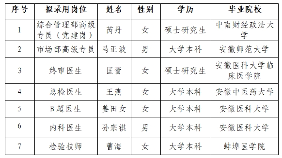 根据《合肥产投康养集团有限公司及子公司2024年度社会招聘公告》及《合肥产投康养集团有限公司招聘管理办法》规定,经笔试、面试、体检考察等程序,现将合肥产投康养集团有限公司2024年度社会招聘拟录用情况予以公示。