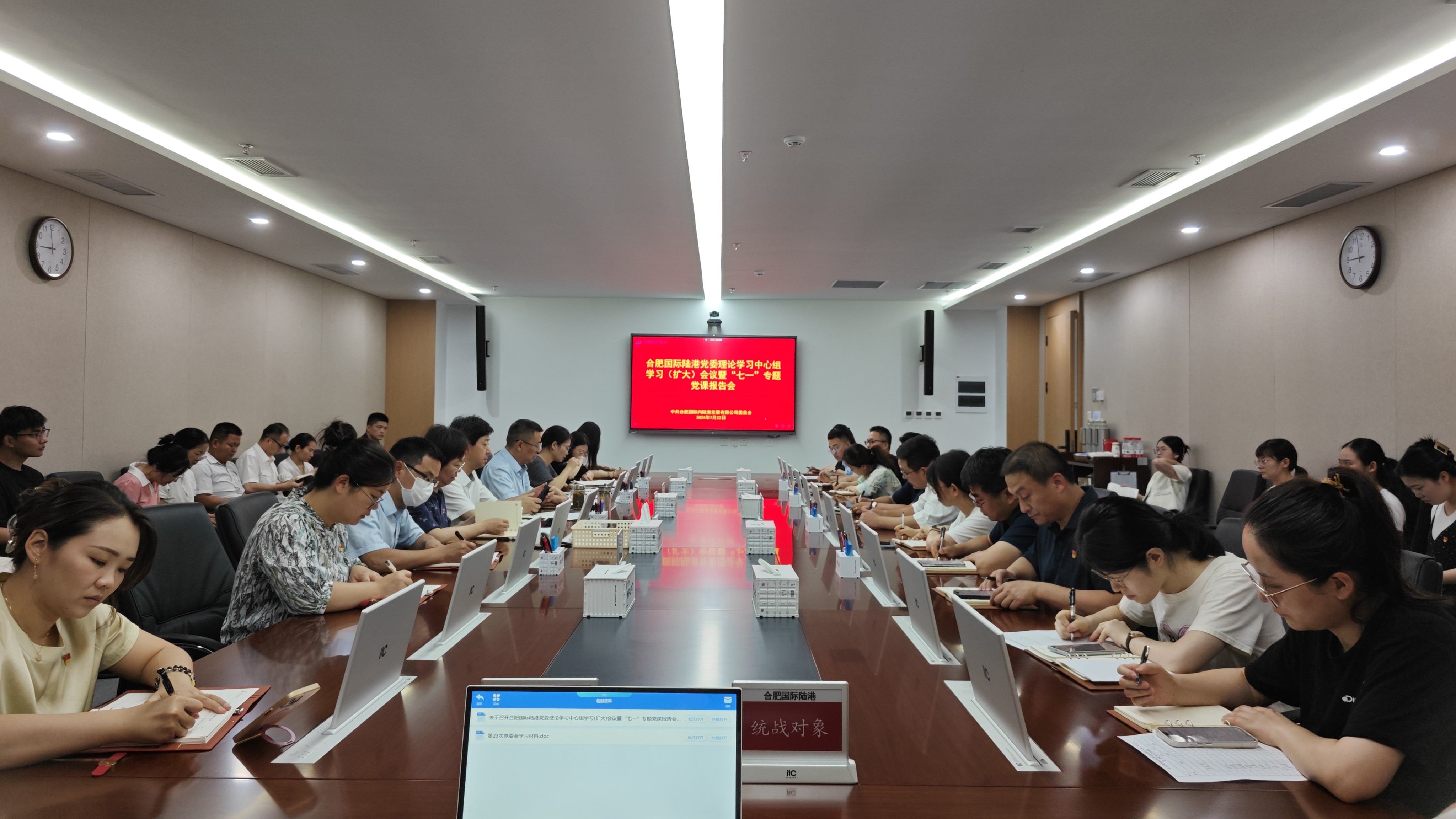 为庆祝中国共产党成立103周年,深入学习贯彻习近平新时代中国特色社会主义思想和党的二十大精神,扎实开展党纪学习教育,引导全体党员坚定理想信念,牢记初心使命。7月22日,合肥国际陆港召开党委理论学习中心组学习(扩大)会议暨“七一”专题党课报告会。合肥物流集团党委副书记、总经理刘军列席指导,合肥物流集团第一党支部全体党员,合肥国际陆港全体党员、计划财务部全体员工、统战对象近50人参加会议。
