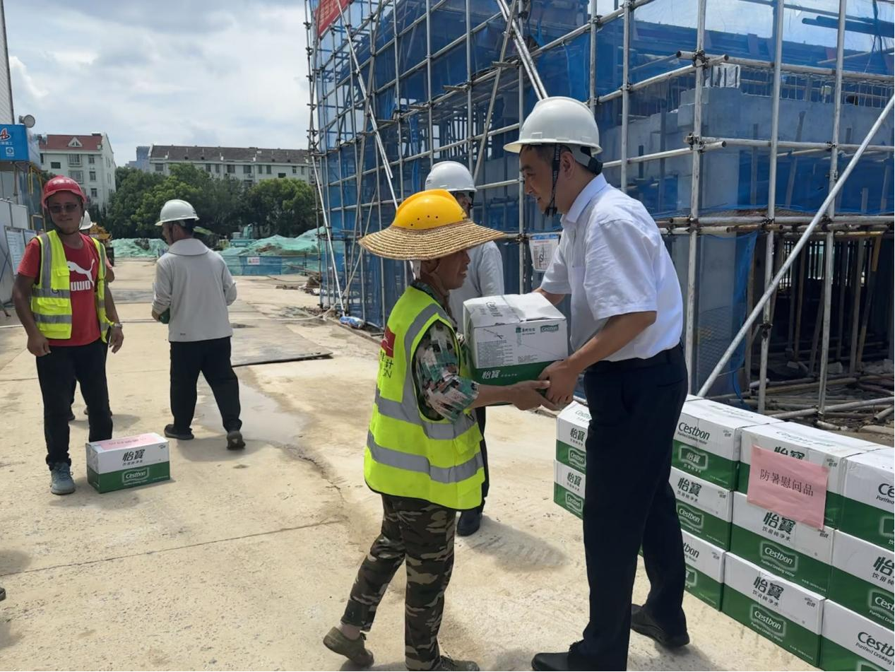 慰问组一行在园区改造现场查看施工进展情况,详细听取了项目施工进度、安全、质量落实情况以及高温作业防暑降温措施,对项目全体人员在高温酷暑情况下仍然坚持在一线抢抓工期表示肯定,并送上矿泉水、毛巾、藿香正气水等防暑降温物资,在炎炎夏日送去关怀和丝丝清凉。江鑫指出,各项目人员在做好防暑降温的同时,应合理调整工作时间、优化工作方式、强化安全作业管理、增强自我防护意识,避免在高温时段户外长时间工作。