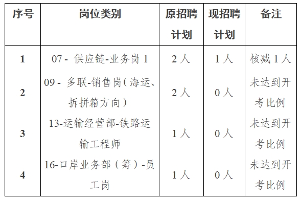 根据《合肥物流控股集团有限公司2024年度社会招聘公告》第五条第(四)项规定,对部分岗位招聘计划数未达到开考比例,现予以核减和取消。具体如下: