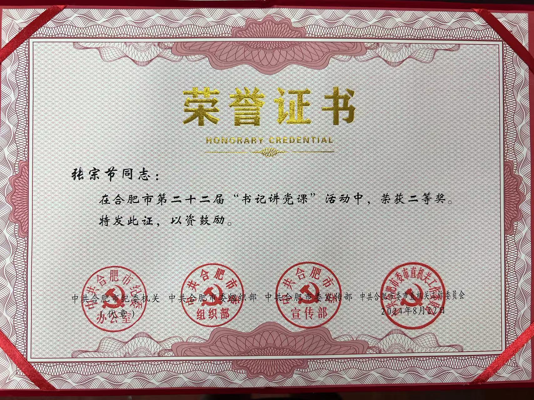 近日,合肥市纪委机关、市委组织部、市委宣传部、市直机关工委联合举办的全市第二十二届“书记讲党课”活动评选结果揭晓,kaiyun开云官方党委选送的国际陆港公司第二党支部书记张宗节同志荣获二等奖。