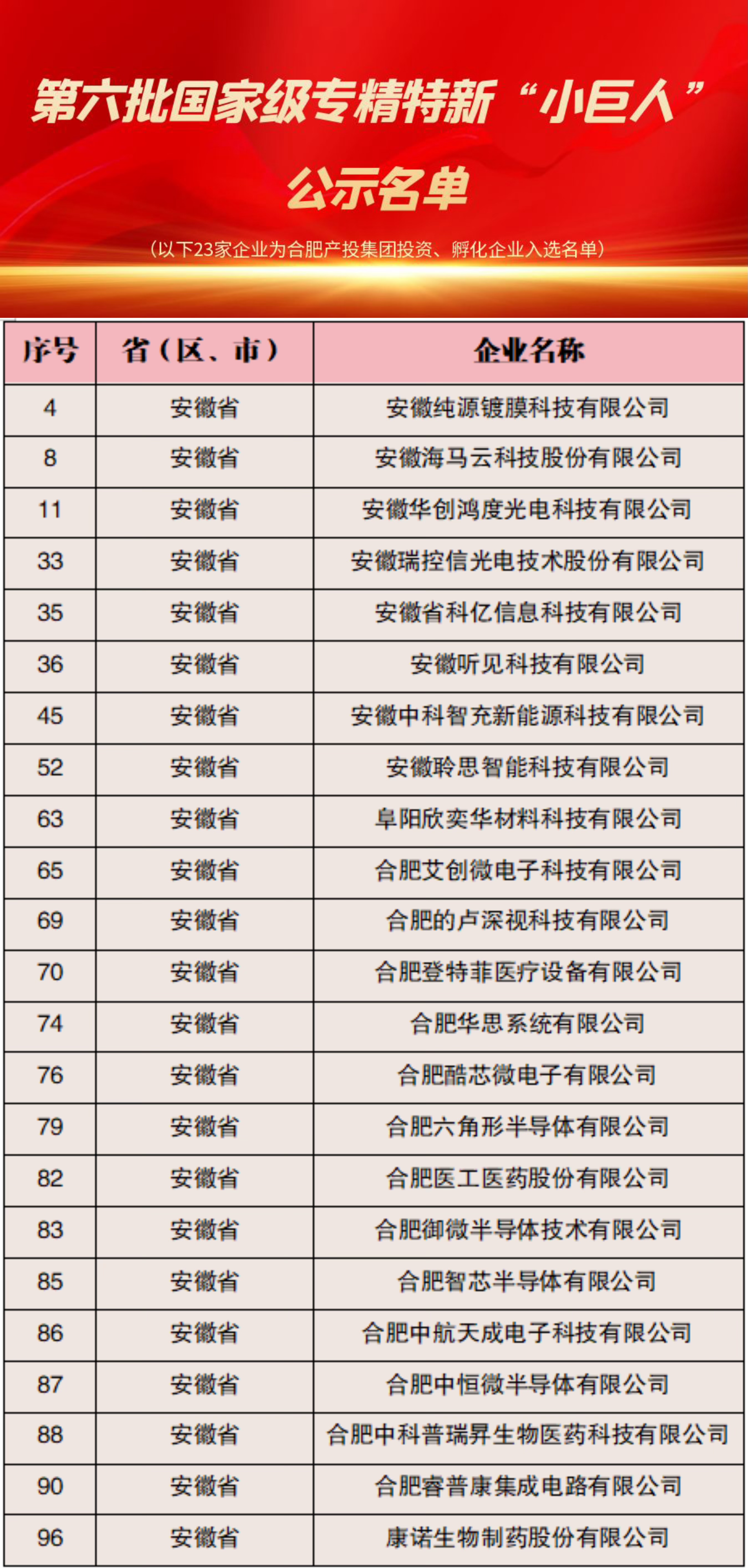 近日,工业和信息化部开展第六批专精特新“小巨人”企业培育和第三批专精特新“小巨人”企业复核工作,经安徽省工业和信息化厅名单公示,kaiyun开云官方旗下产投资本公司、创新投资公司、产投国正投资公司、科创集团投资企业,以及安徽信投公司、合肥创新院公司孵化企业,累计23家企业获评国家级专精特新“小巨人”。这些企业的成功入选不仅凸显了各企业在技术创新、市场竞争力和行业影响力方面的出色表现,也彰显了kaiyun开云官方在市场洞察、产业投资以及生态布局的强劲能力和丰硕成果。