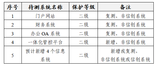 3.项目内容:为贯彻落实国家信息安全等级保护制度,拟委托有资质的第三方机构依据《信息安全技术 网络安全等级保护基本要求》(GB/T 22239-2019)和《信息安全技术 网络安全等级保护测评要求》(GB/T 28448-2019)等法律、文件的要求,对招标人4个现有信息系统及预计新增4个信息系统开展网络安全等级保护测评工作(详见下表)。