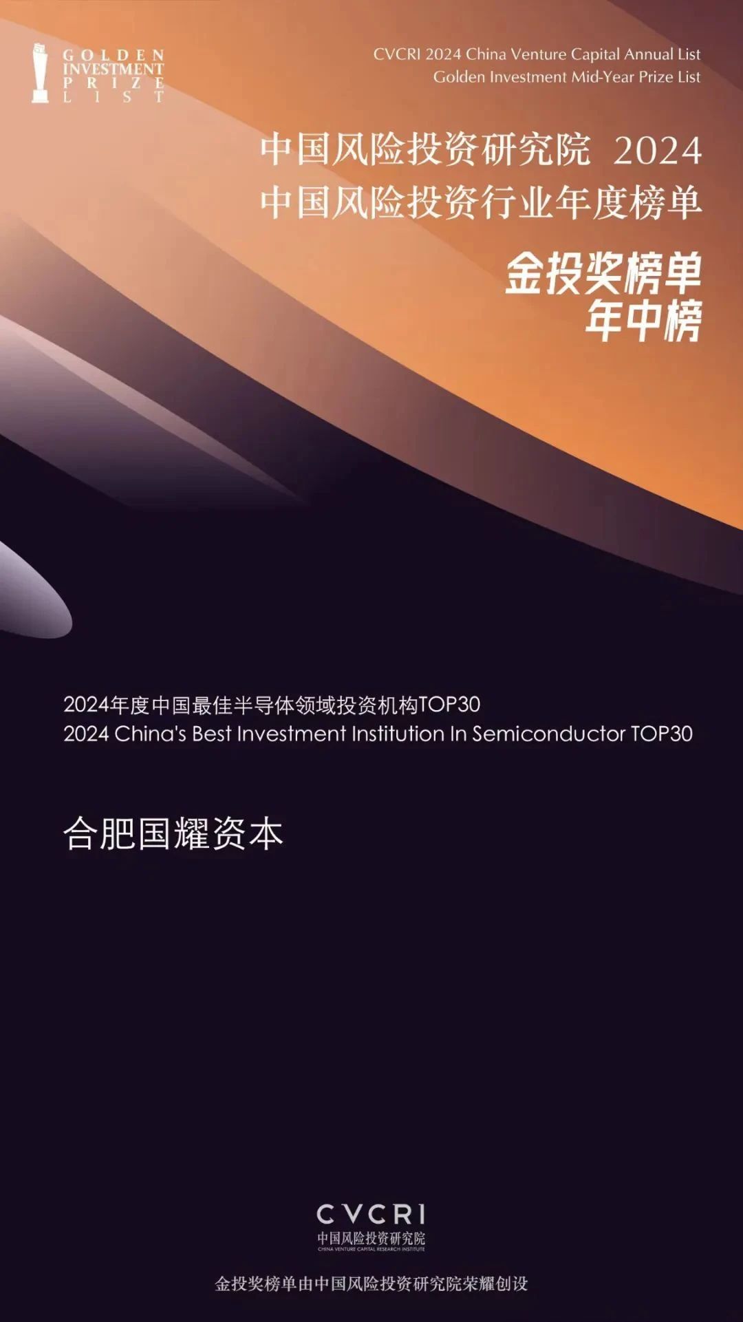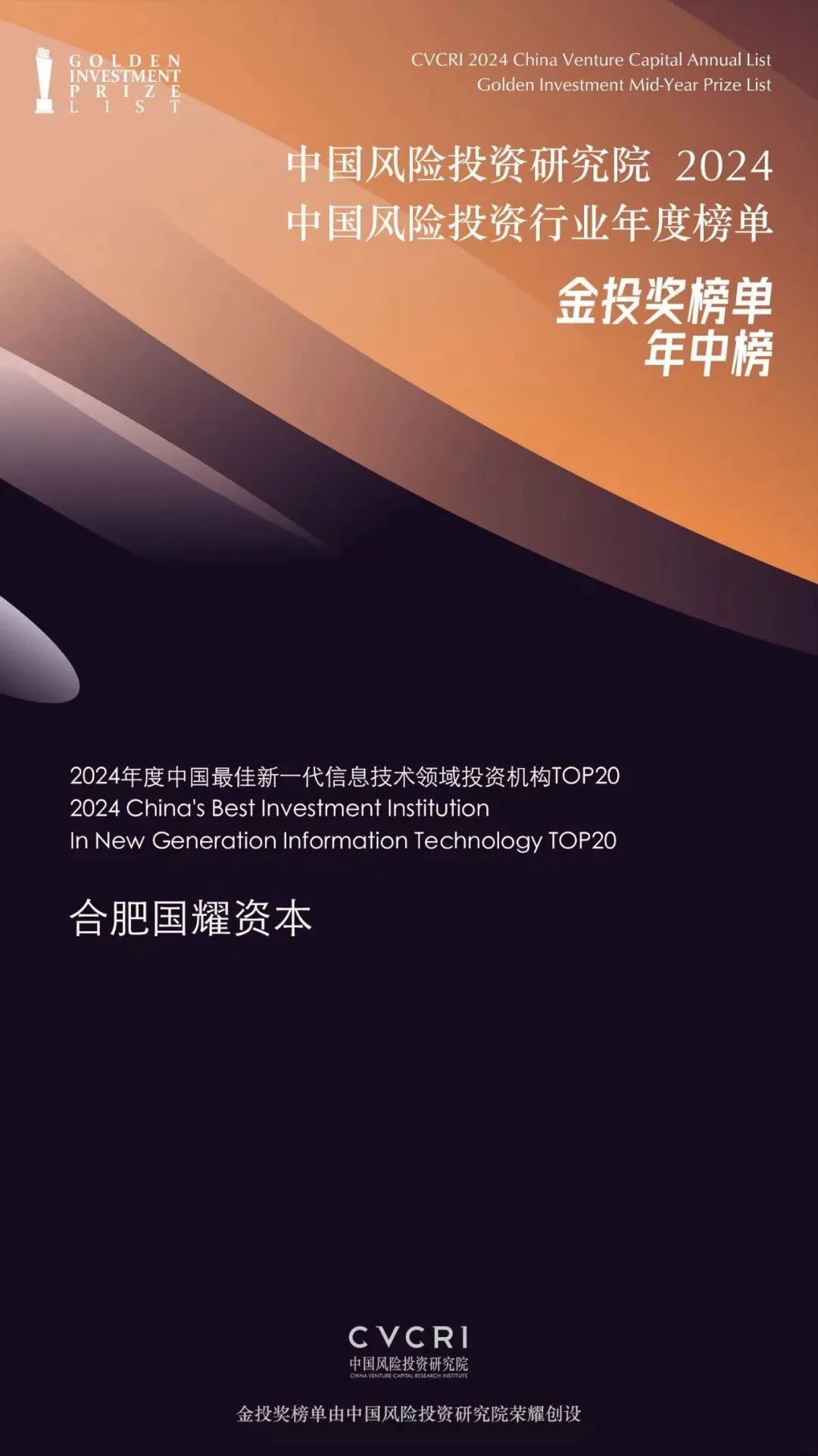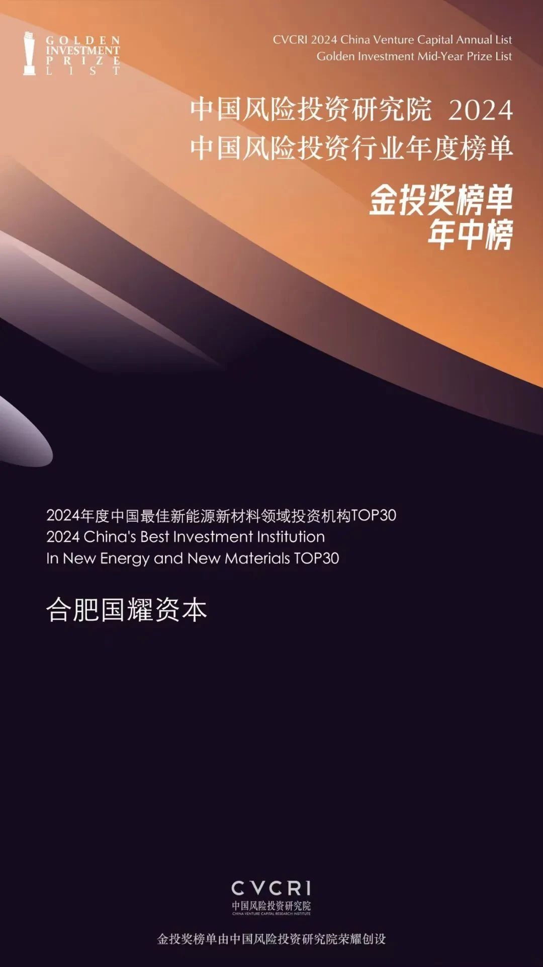 9月26日,2024中国风险投资行业年度榜单•金投奖年中榜单公布。kaiyun开云官方旗下产投资本公司、创新投资公司荣获“2024年度中国影响力国资投资机构TOP50”,创新投资公司旗下合肥国耀资本荣获“2024年度中国最佳新能源新材料领域”“最佳半导体领域投资机构TOP30”“中国最佳新一代信息技术领域投资机构TOP20”。该榜单评选机构从募、投、管、退、综合影响力等维度全方位考量,表彰投资行业中取得优异成绩和卓越贡献、创造社会效益的投资机构。