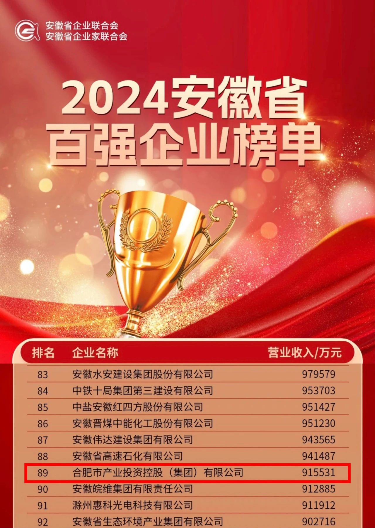 此次入选2024安徽省百强企业、2024安徽省服务业百强企业双榜单,充分彰显了集团的行业综合实力,展现了集团持续增长的社会影响力。未来,集团将全面学习贯彻习近平总书记考察安徽重要讲话精神,深入实施国企改革深化提升行动,拿出“人生能有几回搏”的拼劲,为地方产业高质量发展贡献产投力量。
