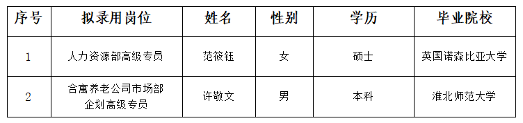 根据《合肥产投康养集团有限公司及子公司2024年度社会招聘公告》及《合肥产投康养集团有限公司招聘管理办法》规定,经笔试、面试、体检考察等程序,现将合肥产投康养集团有限公司2024年度社会招聘拟录用情况予以公示。