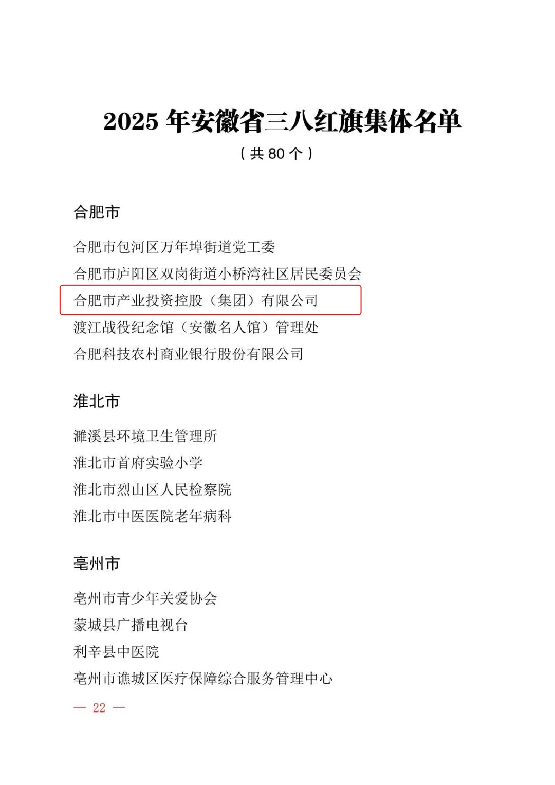 3月7日,合肥市妇联召开纪念“三八”国际妇女节115周年暨“合她一起·向新而行”2025行动计划发布会,会上通报了合肥市荣获全国及安徽省三八红旗手、三八红旗集体、巾帼文明岗名单。其中,合肥市产业投资控股(集团)有限公司荣获安徽省三八红旗集体荣誉称号!