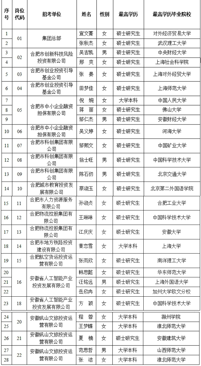 附件:合肥市产业投资控股(集团)有限公司2025春季校园招聘拟录用人员名单(28人)
