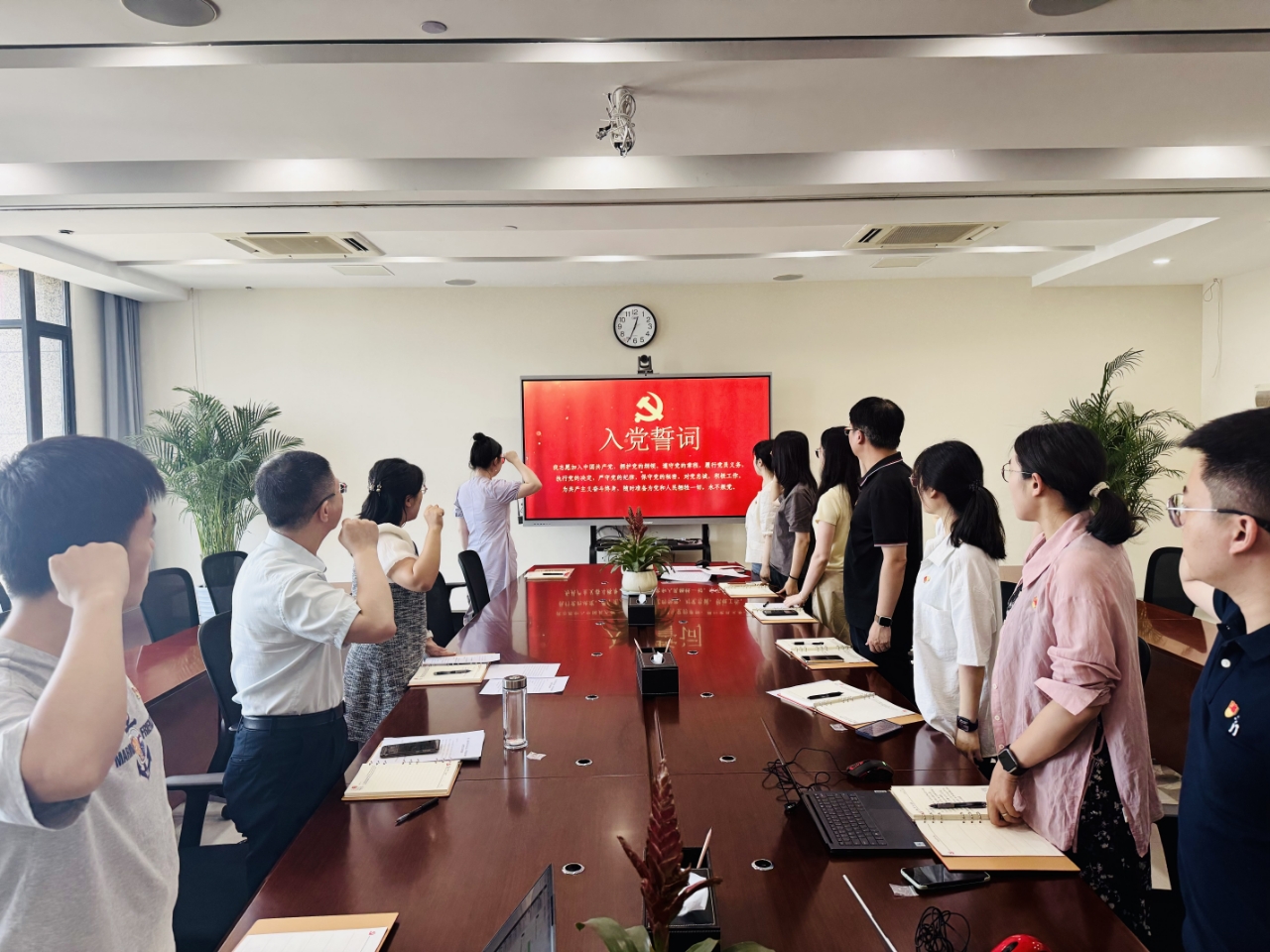 在重温入党誓词环节,全体党员庄严举拳,铿锵誓言响彻会场,重温入党初心,强化身份认同与责任担当,再次坚定为党的事业奋斗终身的信念。