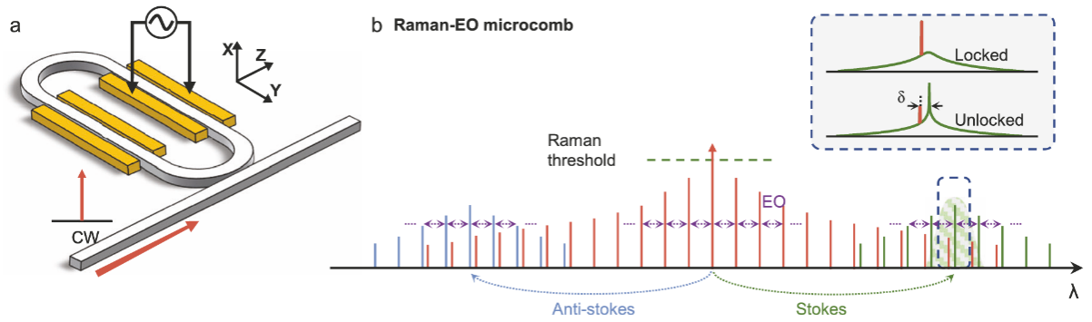 中科大先研院团队实现片上自锁定宽带拉曼电光微梳。中科大郭光灿团队在高性能片上光频梳的研究中取得重要进展,团队首次在铌酸锂微腔中联合调控电光效应、克尔非线性和拉曼散射,实现了一种新型自锁定拉曼-电光微梳(REO microcomb)的构建方案。该微梳无需外部电子反馈,即可自适应锁定,实现超过300nm光谱宽度和26.03GHz重复频率,展现出良好的相干性和可调性。该研究为构建更高性能、更稳定的片上光频梳系统提供了新思路,并为探索片上多非线性物理过程(如注入锁定、自同步等)提供了实验平台。