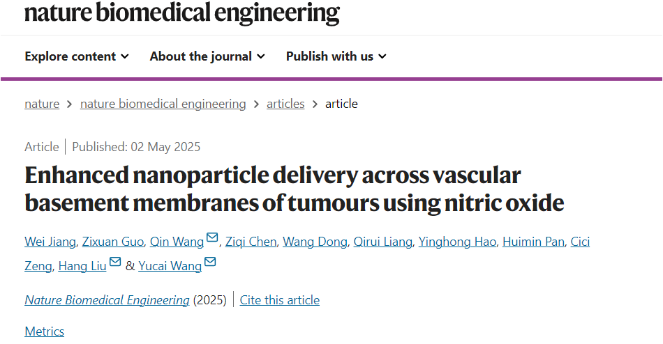 大健康研究院发现利用一氧化氮突破肿瘤血管基底膜屏障,增强纳米药物肿瘤递送。合肥综合性国家科学中心大健康研究院资深研究员王育才团队在《Nature Biomedical Engineering》在线发表研究论文,该研究聚焦于纳米药物递送效率的关键屏障—肿瘤血管基底膜,提出利用一氧化氮(NO)精准空间催化降解的策略,通过特异性调控肿瘤相关内皮细胞,实现对基底膜屏障的高效突破,从而显著提升纳米药物在肿瘤组织内的递送效率。