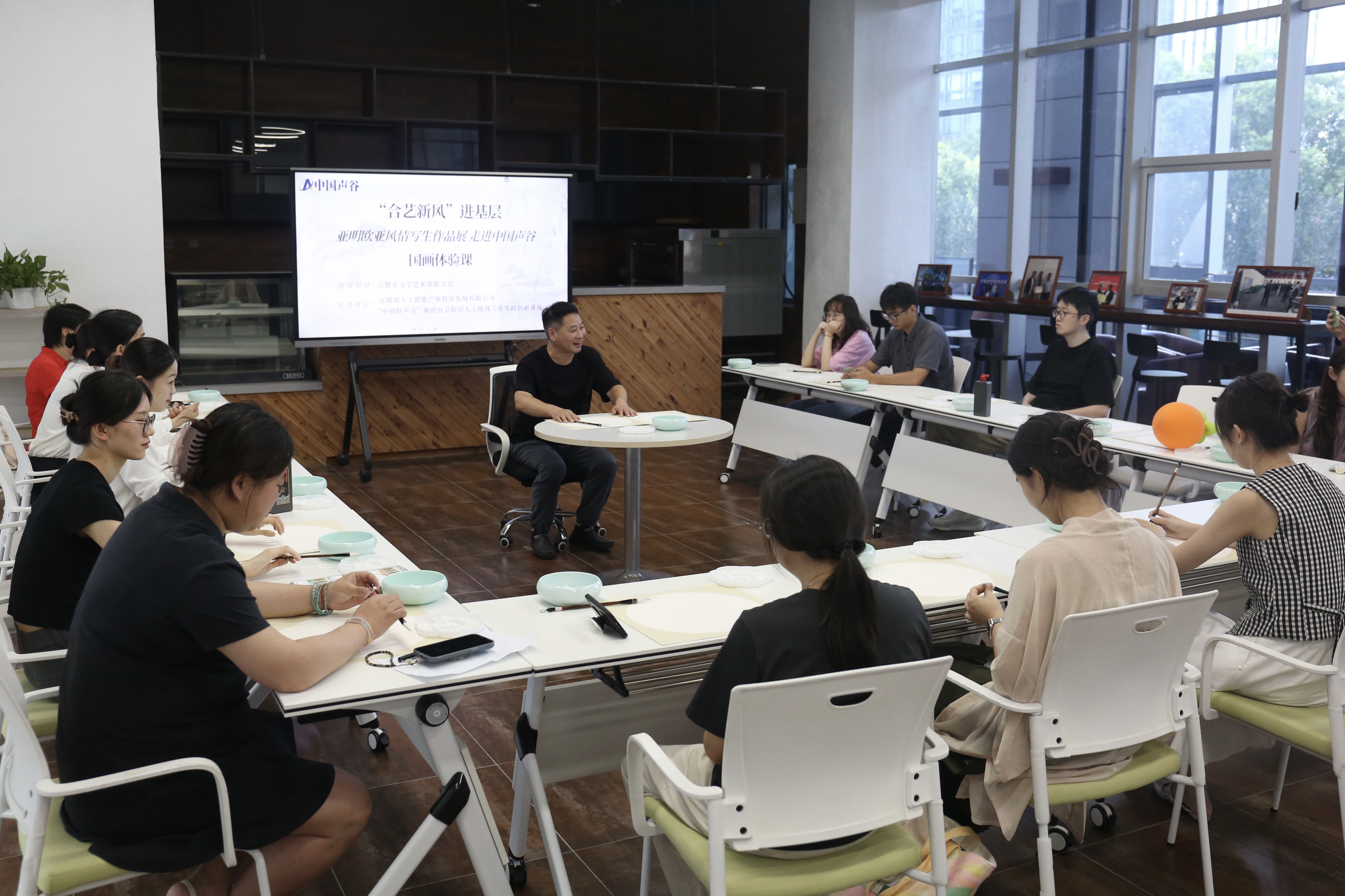 为全面提升园区的文化温度与艺术活力,7月23日,该场艺术作品展配套公教活动国画体验课在中国声谷正式“开讲”。活动特别邀请中国美术家协会会员,安徽省文联国画创作院副院长兼秘书长葛涛现场授课。葛涛老师围绕国画创作历史渊源、艺术特点及创作理念,从基础的握笔、运笔,到水墨的浓淡晕染,为大家进行细致讲解和示范,并分享自己的创作心得感悟,为园区职工群众和新的社会阶层人士带来了一场兼具文化底蕴与文艺气息的“艺术盛宴”。