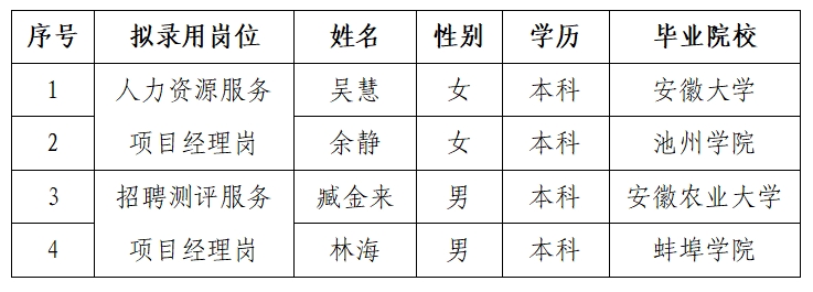 根据《合肥市人才发展集团有限公司所属子公司2025年上半年社会招聘公告》的规定,经网上报名、资格审查、线上测评、笔试、面试、体检考察等程序,现将拟录用人员公示如下: