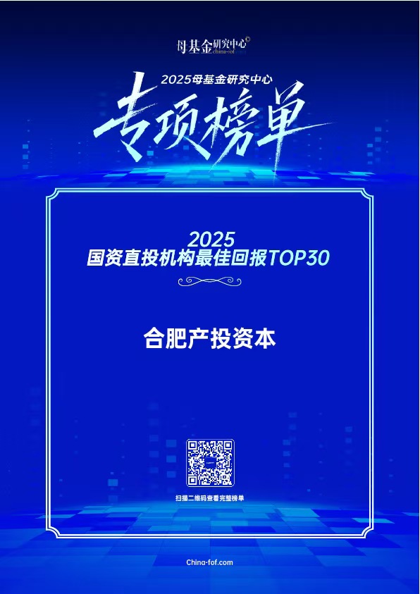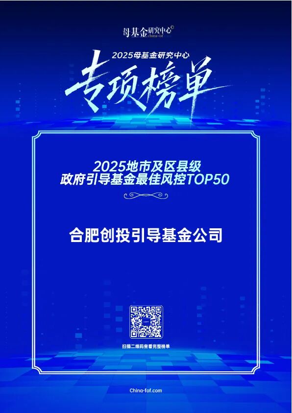9月1日,母基金研究中心正式发布2025年度专项榜单,合肥产投资本荣获“2025国资直投机构最佳回报TOP30”称号;合肥创投引导基金荣获“2025地市及区县级政府引导基金最佳风控TOP50”称号。