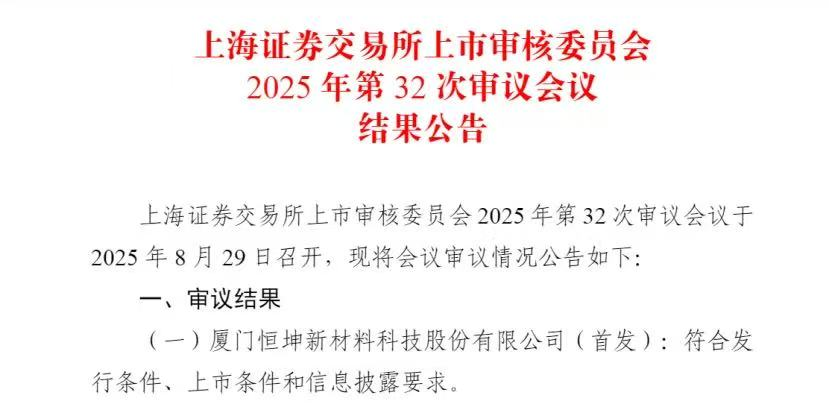 8月29日,上交所上市审核委员会2025年第32次审议结果公告显示,合肥创投引导基金参股子基金农银穗禾基金投资企业——厦门恒坤新材料科技股份有限公司(以下简称恒坤新材)首次公开发行股票并在科创板上市的申请,顺利通过审议。