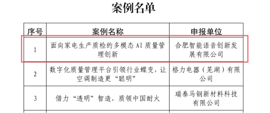 近日,安徽省市场监管局、省工业和信息化厅发布了“2025年安徽省数字化质量管理创新与实践十大典型案例”。国家智能语音创新中心的“面向家电生产质检的多模态AI质量管理创新”案例凭借领先的技术实力与显著的实践成效,在此次评选中荣登榜首,以顺位第一的优异成绩成功入选,并在9月13日召开的2025年安徽省暨合肥市“质量月”活动启动仪式上正式获颁证书。