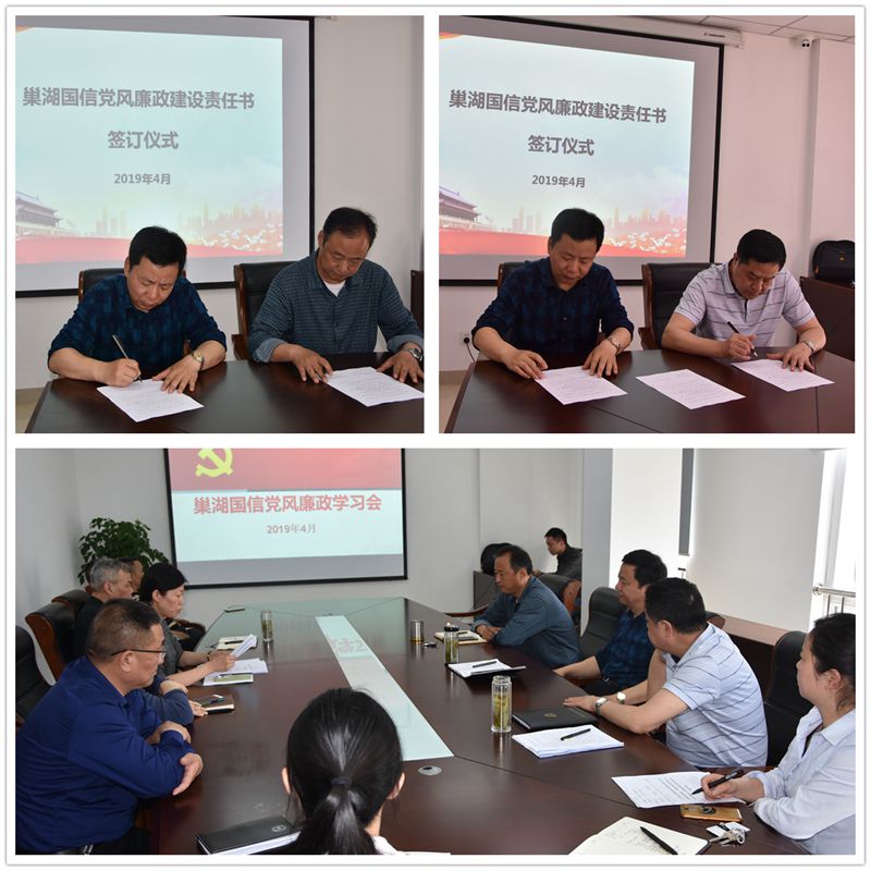 为深入贯彻党的十九大精神及习近平总书记新时代中国特色社会主义思想,按照集团2019年党风廉政建设工作会议要求,强化领导班子成员管党治党政治责任,推动党风廉政建设“两个责任”的落实,2019年4月19日上午,公司党总支书记与领导班子成员签订了《党风廉政建设责任书》。