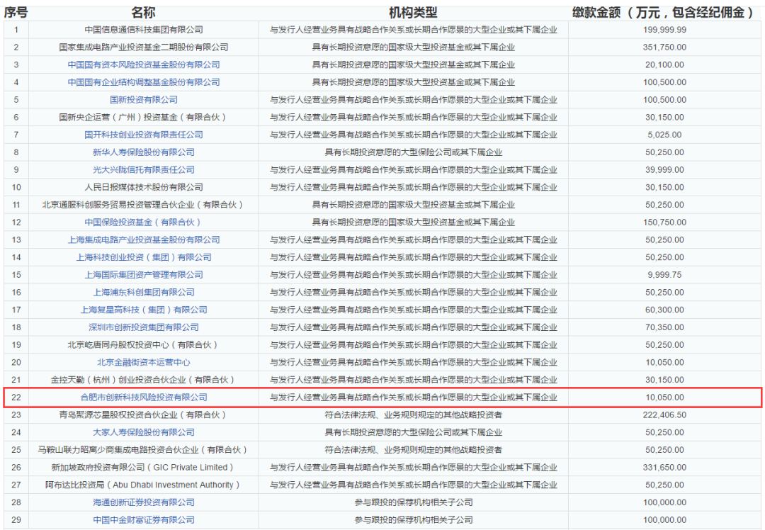 7月5日晚间,中芯国际公布科创板发行战略配售结果,此次战略配售对象共29家,初始战略配售84281万股,合计配售金额共242.61亿元。其中,kaiyun开云官方通过全资子公司合肥市创新科技风险投资有限公司参与配售,成为中芯国际的战略投资者,也是中芯国际上市战略投资者中唯一一家市级投资机构。