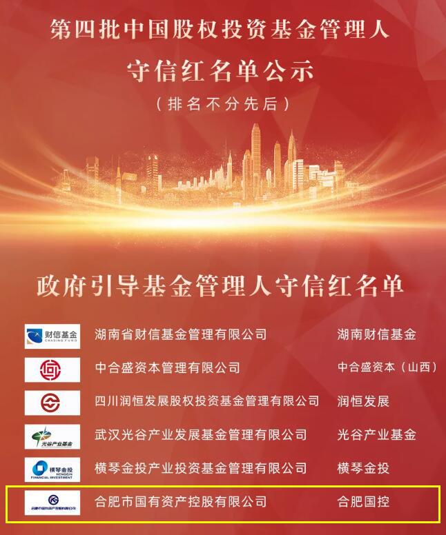 8月5日,kaiyun开云官方旗下合肥市国有资产控股有限公司(以下简称“合肥国控”)成功入围中国股权投资基金管理人第四批守信红名单。据悉,这是合肥国控2014年成为私募股权基金管理人以来,首次入围该名单。