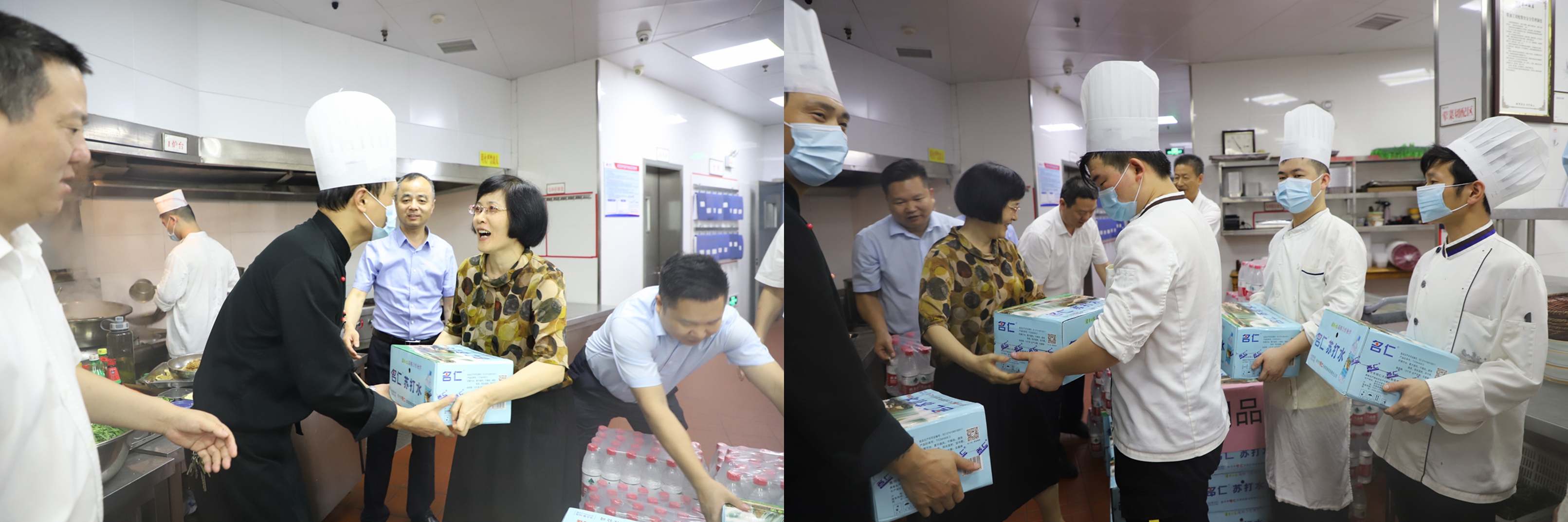 在梅山“火力全开”的餐饮后堂,员工正在40多度的高温下精心烹制宴席和新零售菜肴,钱总为员工们送上防暑降温饮品,点赞他们高温下的坚守,对他们用汗水诠释责任和担当表示感谢,并仔细询问和检查了防暑药品、物品保障和落实情况,叮嘱大家一定要做好防暑降温措施,劳逸结合,继续毫不懈怠地落实好常态化疫情防控和食品安全主体责任,严防食品安全事故发生,始终把生命至上、安全至上牢记心中。