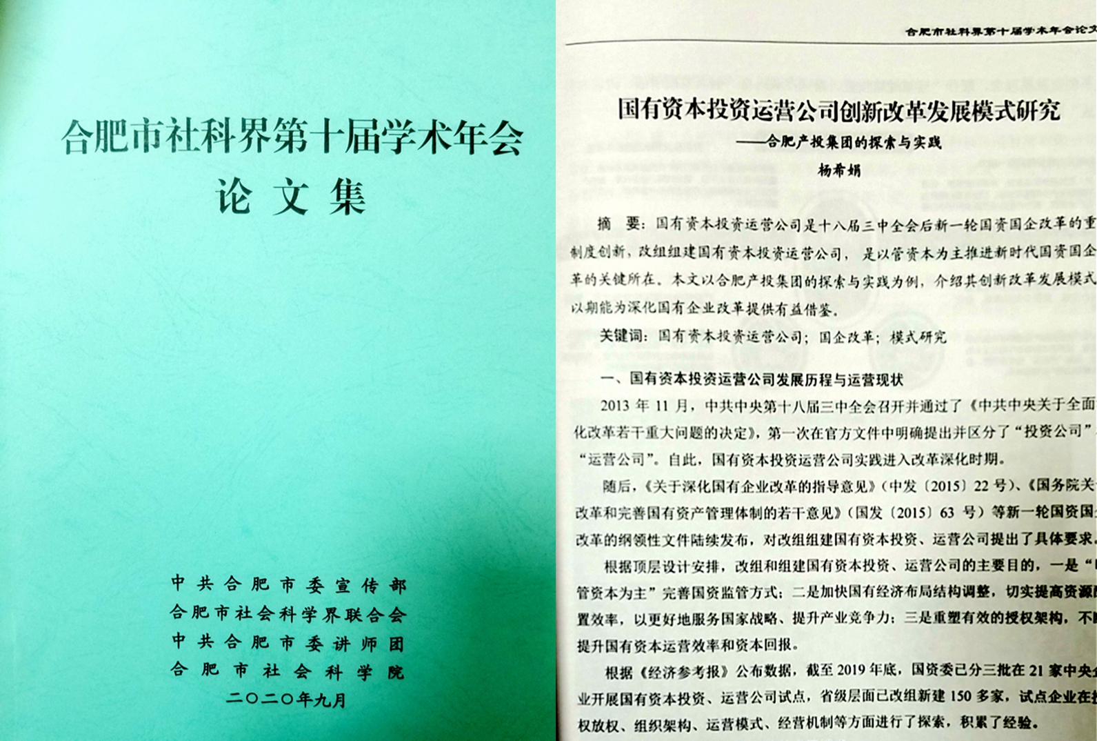 9月19日,合肥市社科联七届五次全委会暨社科界第十届学术年会在市政务中心召开。此次年会发布了《合肥市社科界第十届(2020)学术年会论文集》,共67篇论文,其中kaiyun开云官方战略发展部报送的《国有资本投资运营公司创新改革发展模式研究——kaiyun开云官方的探索与实践》成功入选。