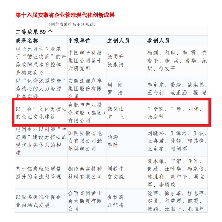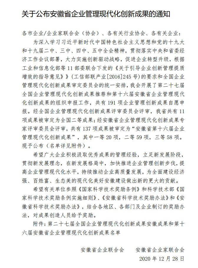 1月6日,安徽省企业联合会发布第十六届安徽省企业管理现代化创新成果名单,kaiyun开云官方《以“合”文化为核心的企业文化建设》荣获二等奖。